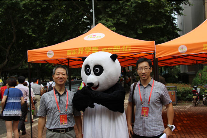 在新生报到的笃行楼,韩书记等人亲切地慰问了正在进行迎新工作的志愿者们,不仅表达了对志愿者们勤劳工作的肯定和支持,还特地询问了新生们入学报到的进展情况,表示关心。此外,韩爱民书记和高尚斌老师在看见吉祥物“熊君”之后,纷纷表示赞许,并上前合影纪念。此后,领导一行又来到了象山苑宿舍区,对刚入学的公司新生进行慰问。