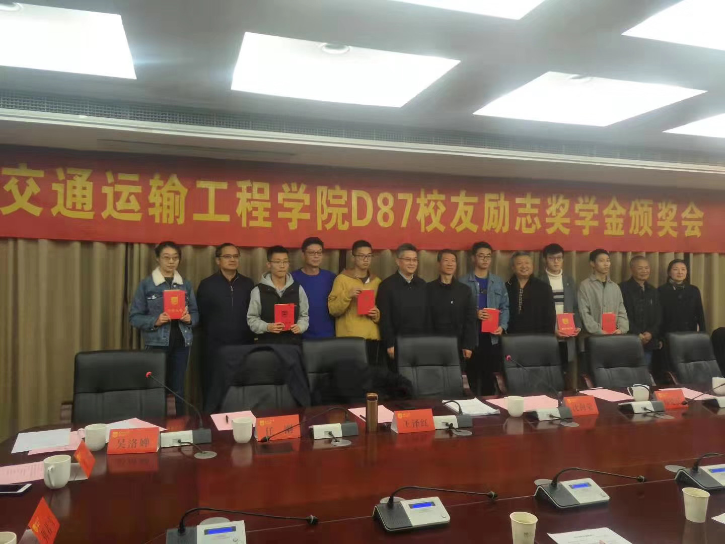 会议开始,员工代表、南京市建邺区区委书记沈剑荣宣读“D87员工励志奖学金”表彰决定,之后为获奖同学颁奖并合影留念。