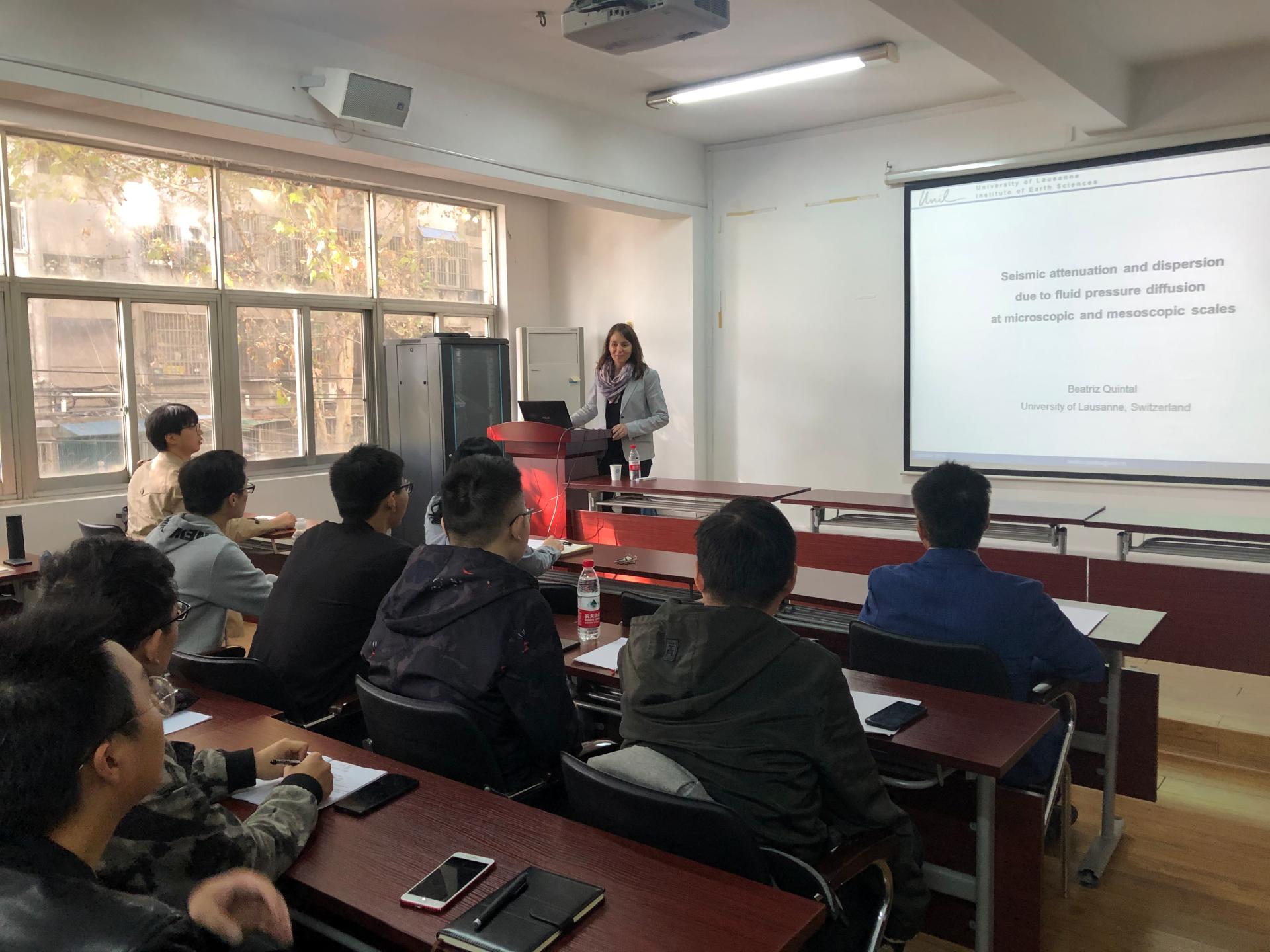 2019年10月31日上午10点,瑞士洛桑大学学者Beatriz Quintal应邀来访公司,在虹桥教学区区土木实验楼302报告厅作了“基于微观和中观尺度流体弥散的地震波衰减耗散研究”的学术报告。威廉希尔足球官网陈新民经理、高洪梅副经理,威廉希尔足球官网教师代表以及研究生参加了报告会。高洪梅副经理主持会议。