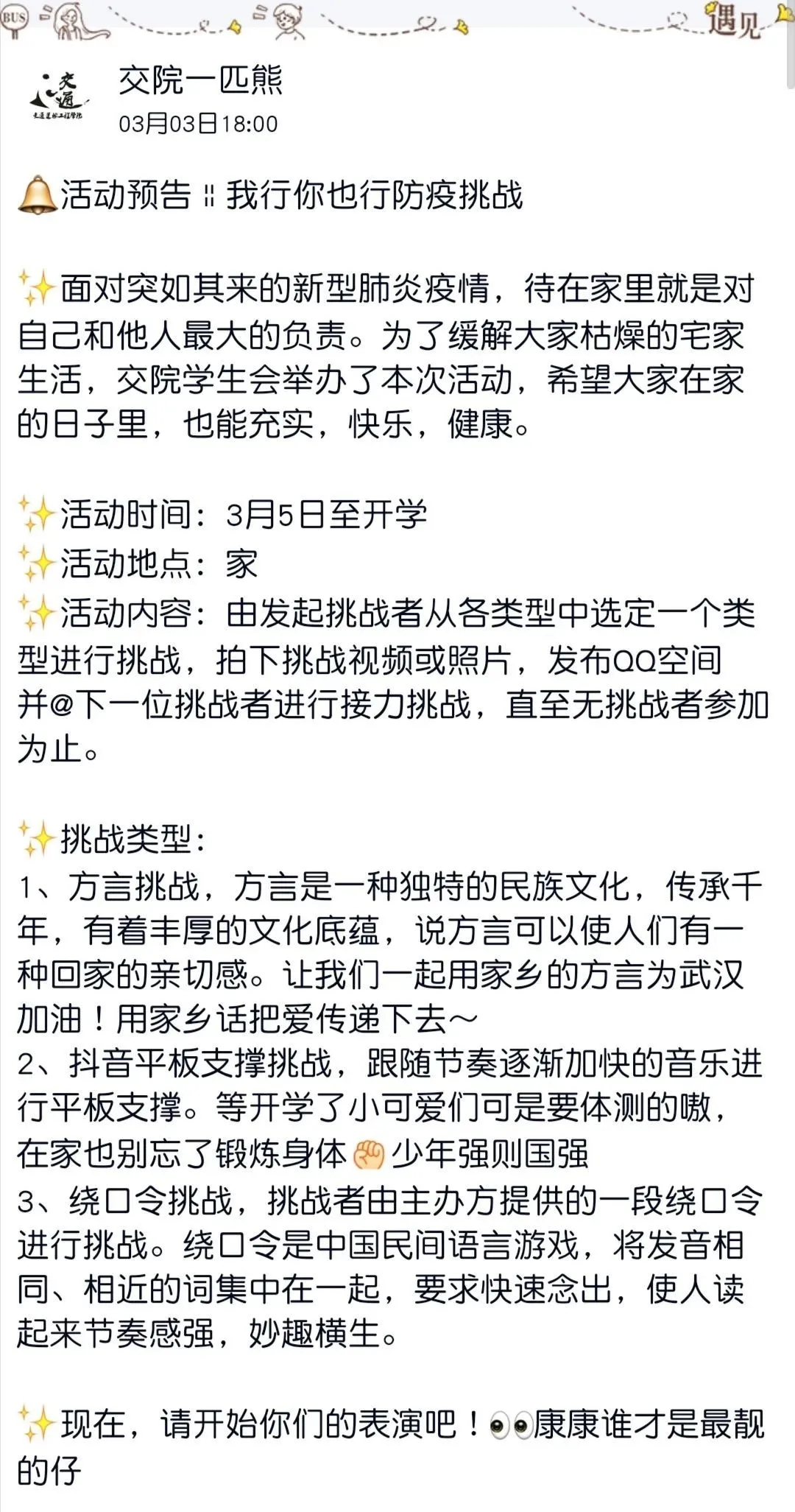第四、开展“你行我也行”接力挑战赛。为帮助同学们锻炼身体、劳逸结合,公司发起了“我行你也行”接力挑战赛,同学们或是用乡音方言为武汉加油,或是挑战平板支撑、绕口令等,活动丰富了同学们的课余生活。