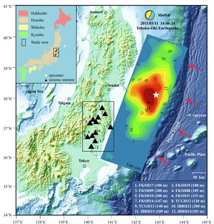 研究还发现东日本大地震主震期间,日本本州岛东部地区(图1)在地表至一两百米深度范围内的地震剪切波速的最大下降幅度约为10%~50%,之后,剪切波速的下降幅度在数分钟内快速下降至约为最大下降幅度的三分之一。随后,近地表剪切波速需要数年甚至数十年才能恢复到震前水平。