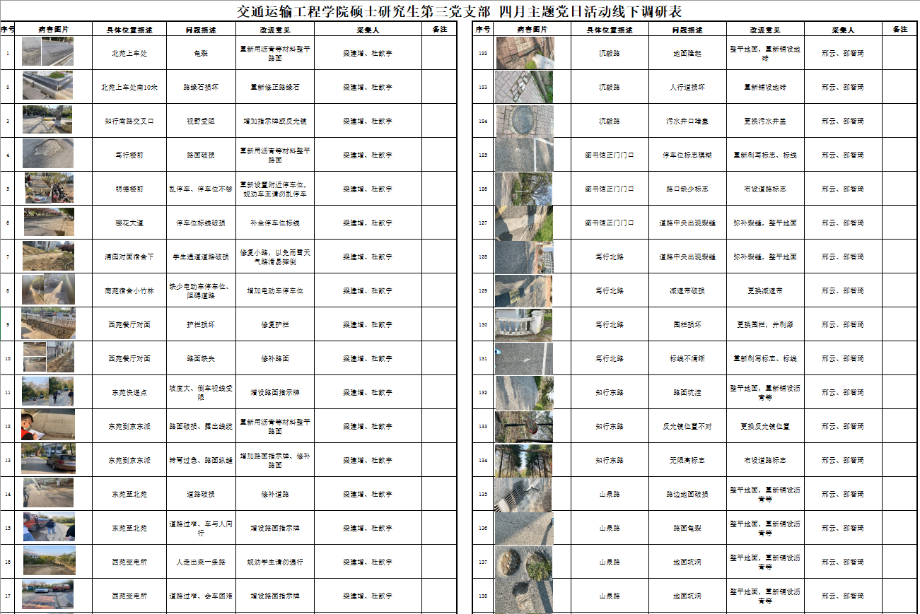 活动历时近一个月,包括5个环节。一是交通安全宣传。制作了宣传手册、海报等30余份,对校内师生进行宣传。二是交通安全勘查。由刘大帅、胡文涛、张吻吻、金玉叶四位党小组组长分4大区域以专业视角对校区内路面病害,交通标志标线等基础设施现状进行现场勘查。三是整理安全隐患报表。将校园内存在安全隐患的地点分别用图片采集并标注信息,整理出一份涵盖166个安全隐患的“江浦校区校园道路安全隐患统计册”,将转交给校园相关部门。四是交通安全讲座。由教师第二支部教师面向全校师生开展一堂校园道路安全的讲座。五是校外交通知识宣讲。待疫情缓解,前往校外交通要道附近、社区进行道路交通知识宣讲,提升群众道路交通安全意识和自我防范能力,造福社会。