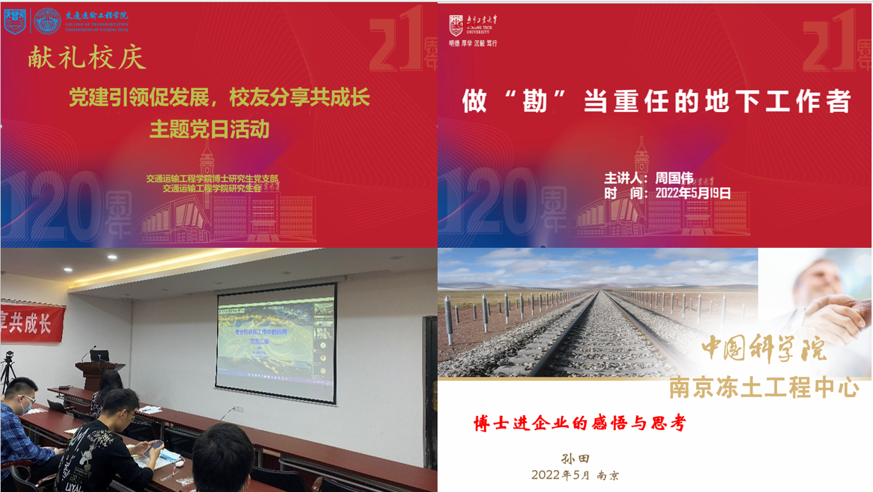 在学校合并组建21周年•办学120周年之际,为加强爱校荣校教育,弘扬南工大精神,5月1日-19日,威廉希尔足球官网博士研究生党支部联合研究生会开展了“献礼校庆—党建引领促发展,员工分享共成长”系列党日活动。活动共收到来自全国各地学院员工20多条寄语,19日晚开展采用线上线下现场分享环节,江苏建院营造股份有限公司董事长助理兼勘察设计院经理周国伟,中圣科技有限公司、中科院南京冻土工程中心副主任孙田,中建海峡建设发展有限公司张峰等员工,公司党委书记许翠梅、组织员闵珍及学院师生共130多名参加活动。活动由博士研究生党支部书记杭天柱主持。