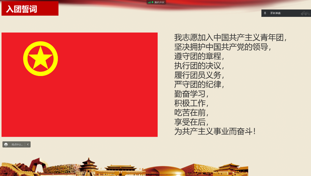 活动中,团支书缪涵同学组织全体团员线上学习了共青团成立100周年以来的辉煌历史,开展团的相关知识竞答,同时带领全体团员重温入团誓词。康喜同学代表团支部录制了红色经典歌曲《我和我的祖国》抒发爱国爱团的热情。