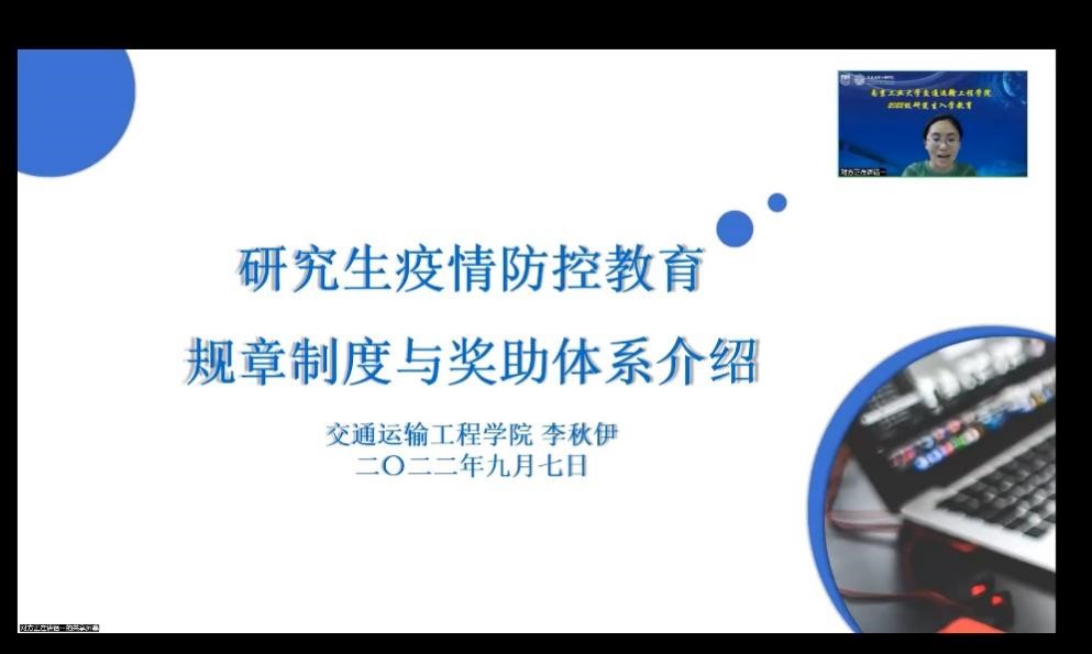 李秋伊老师详细讲解了疫情防控形势和相关知识、研究生规章制度与奖助体系的内容,希望同学们在做好常态化疫情防控工作的基础上历练自我、追求卓越。