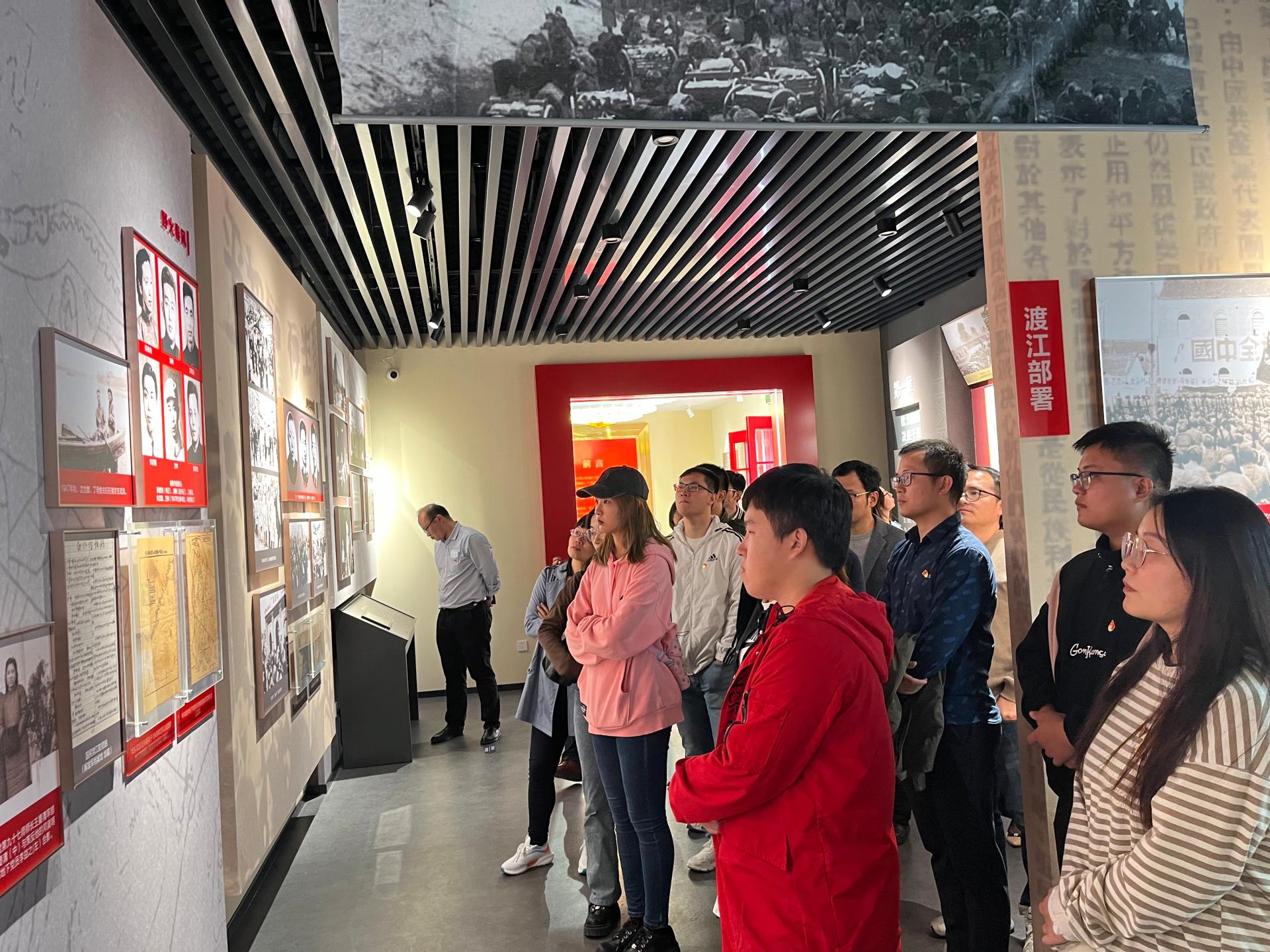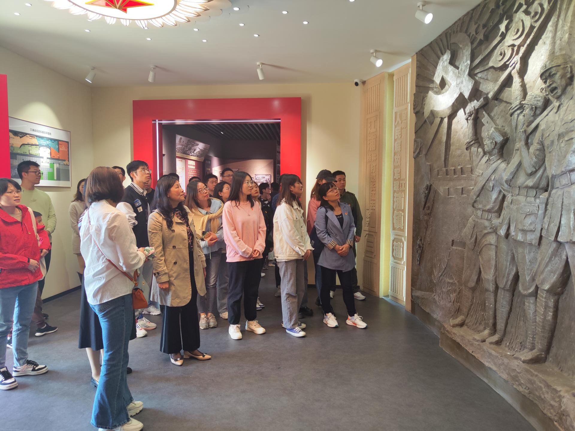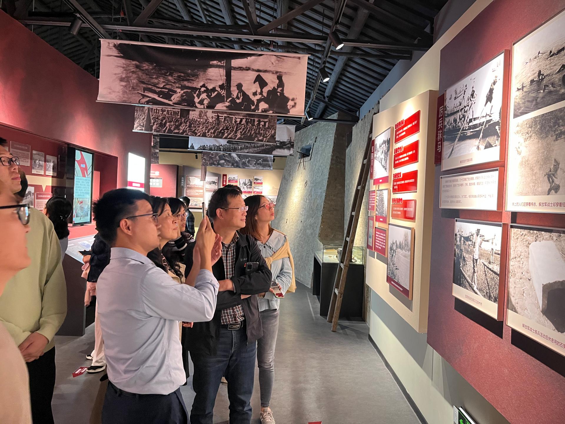 参观伊始,许书记在现场给师生上了一次生动的党课,在二十大即将召开之际,勉励师生和国家和民族同命运、心怀国家和学校的发展、明确未来行动方向。她希望年轻人能够在先辈们英勇事迹中汲取力量,不断奋斗以实现更高的目标。随后,党员们进入场馆参观学习。整个展览分为“枕戈待渡 决胜千里”、“渡江序幕 鏖战三浦”、“大江飞渡 红旗飘扬”、“胜利足迹 继往开来”4个篇章。场馆运用自动滑轨屏、VR体验机、投影仪、触摸屏及视屏等多媒体技术,还原渡江誓师大会、三浦战役浴血奋战、“京电”号小火轮渡江、解放南京等场景,展现“三浦战役”全过程及解放军将士不怕牺牲、勇往直前的战斗精神。参观结束后,由教师第三党支部书记徐令宇领誓,全体党员在党旗前重温入党誓词,每一位党员再一次接受心灵的洗礼,更加坚定理想信念。