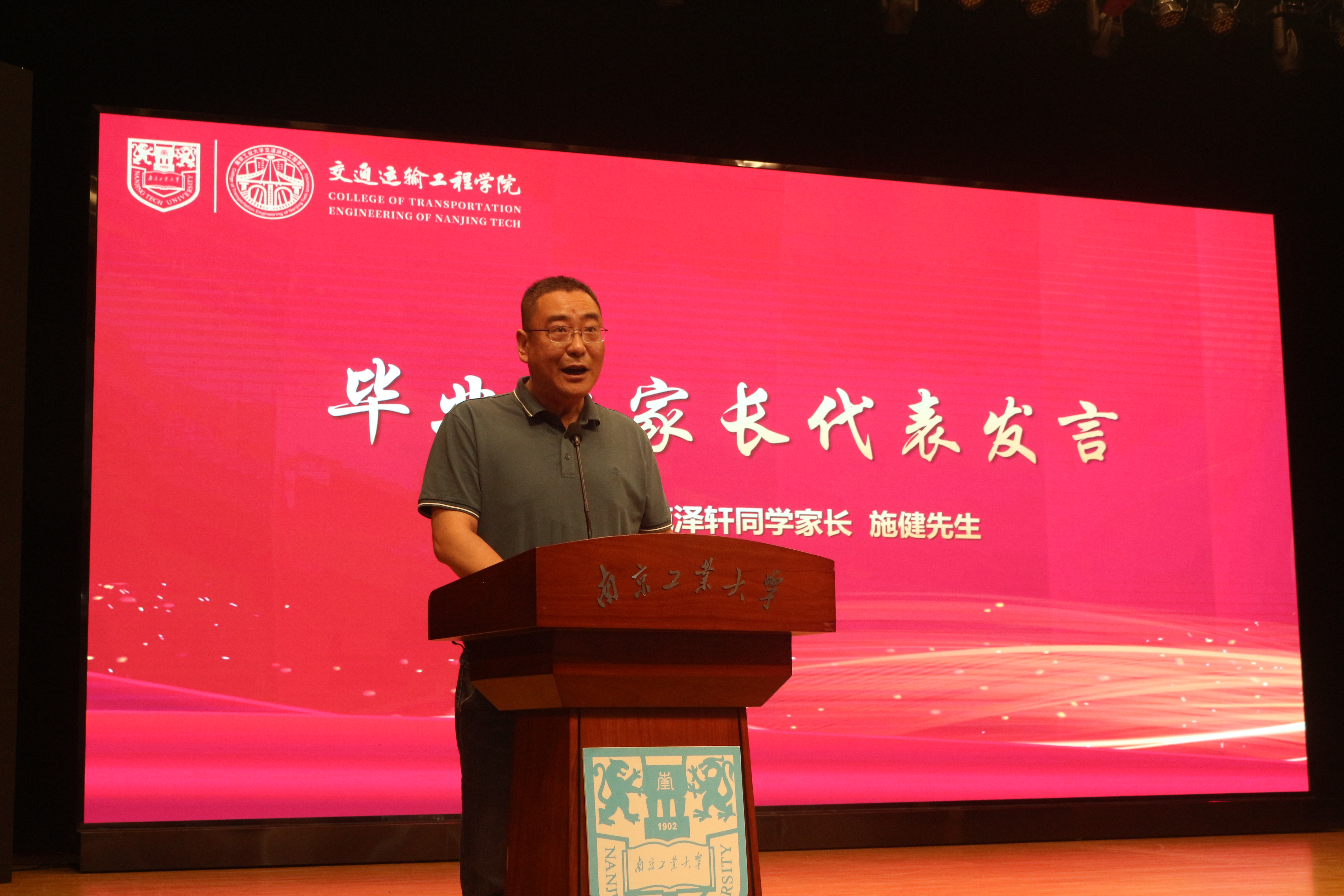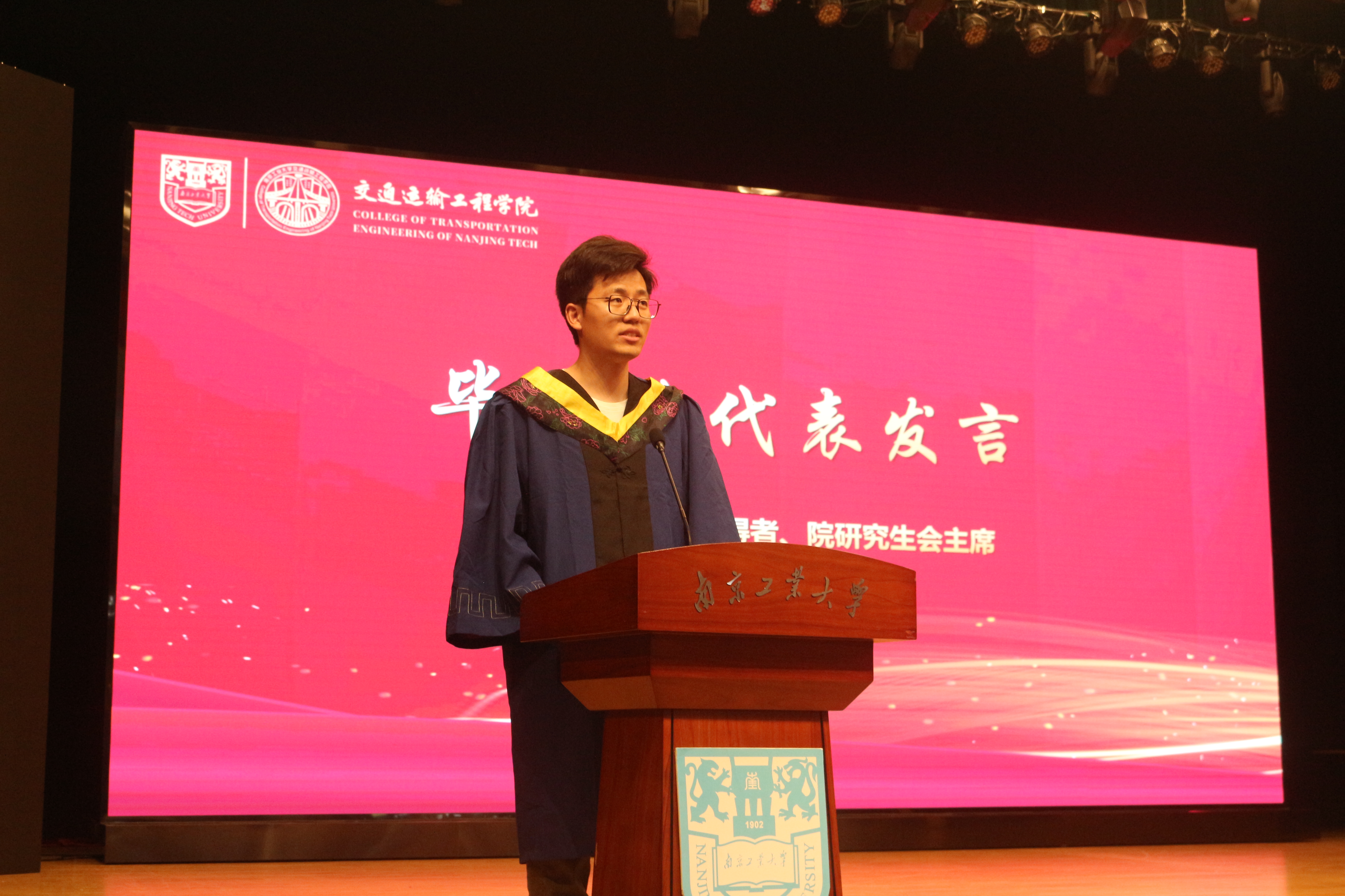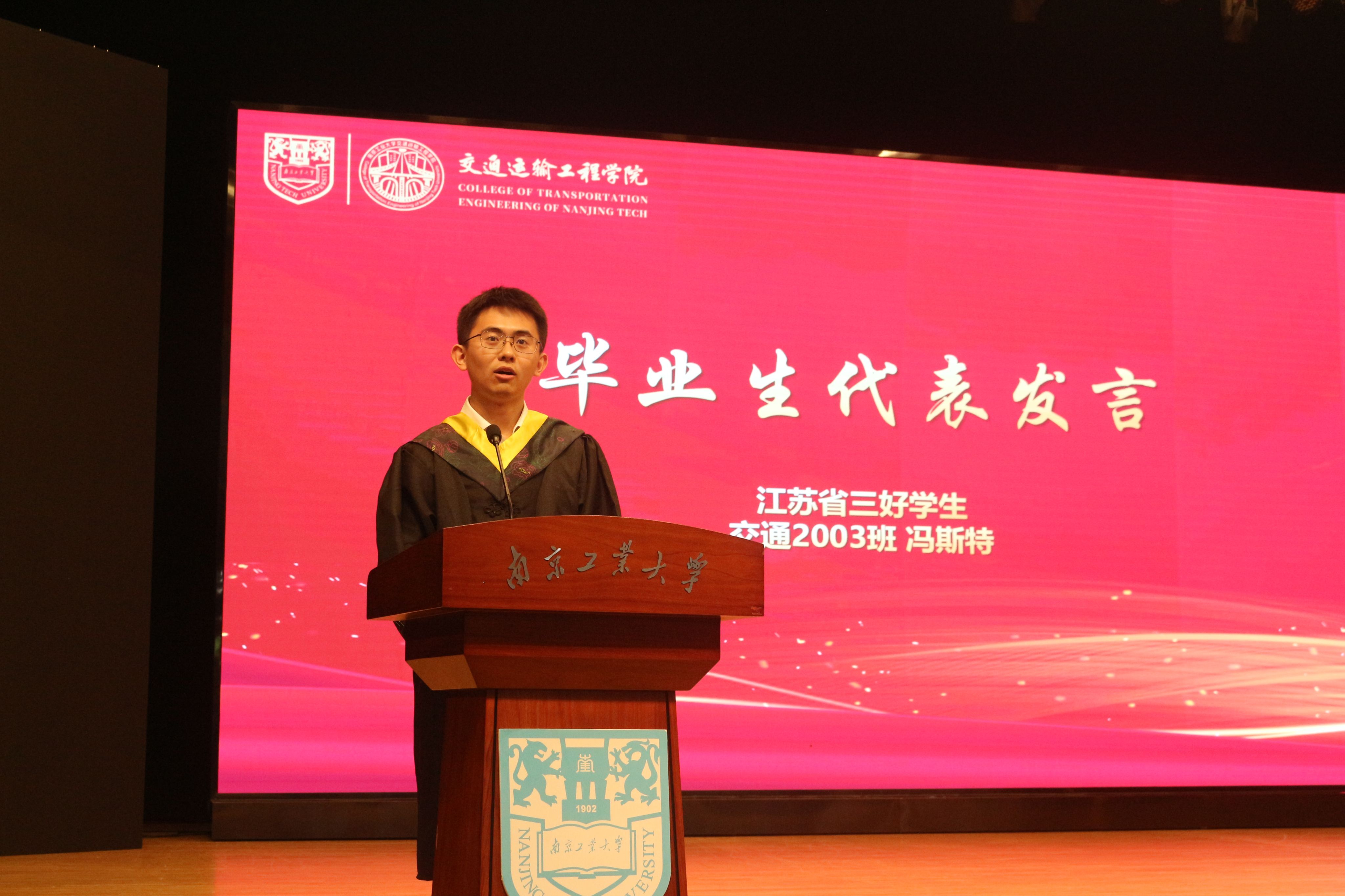 颂情谊,惜别离。毕业生代表交通2003班冯斯特追忆四年奋斗时光,以“莫愁前路无知己,天下谁人不识君”慰藉和激励即将远行的同学们。交研21级储城鑫借“长风破浪会有时,直挂云帆济沧海”祝愿同学们乘风破浪,创造辉煌。毕业生家长代表地下2002施泽轩父亲施健先生向学校学院的领导、老师对孩子们的辛勤付出表示感谢,并祝愿毕业生在人生的大舞台上秀出自己的风采。教师代表地质2001班主任曹呈浩老师号召交院学子要以“千淘万漉虽辛苦、吹尽狂沙始到金”的恒心顽强奋斗。