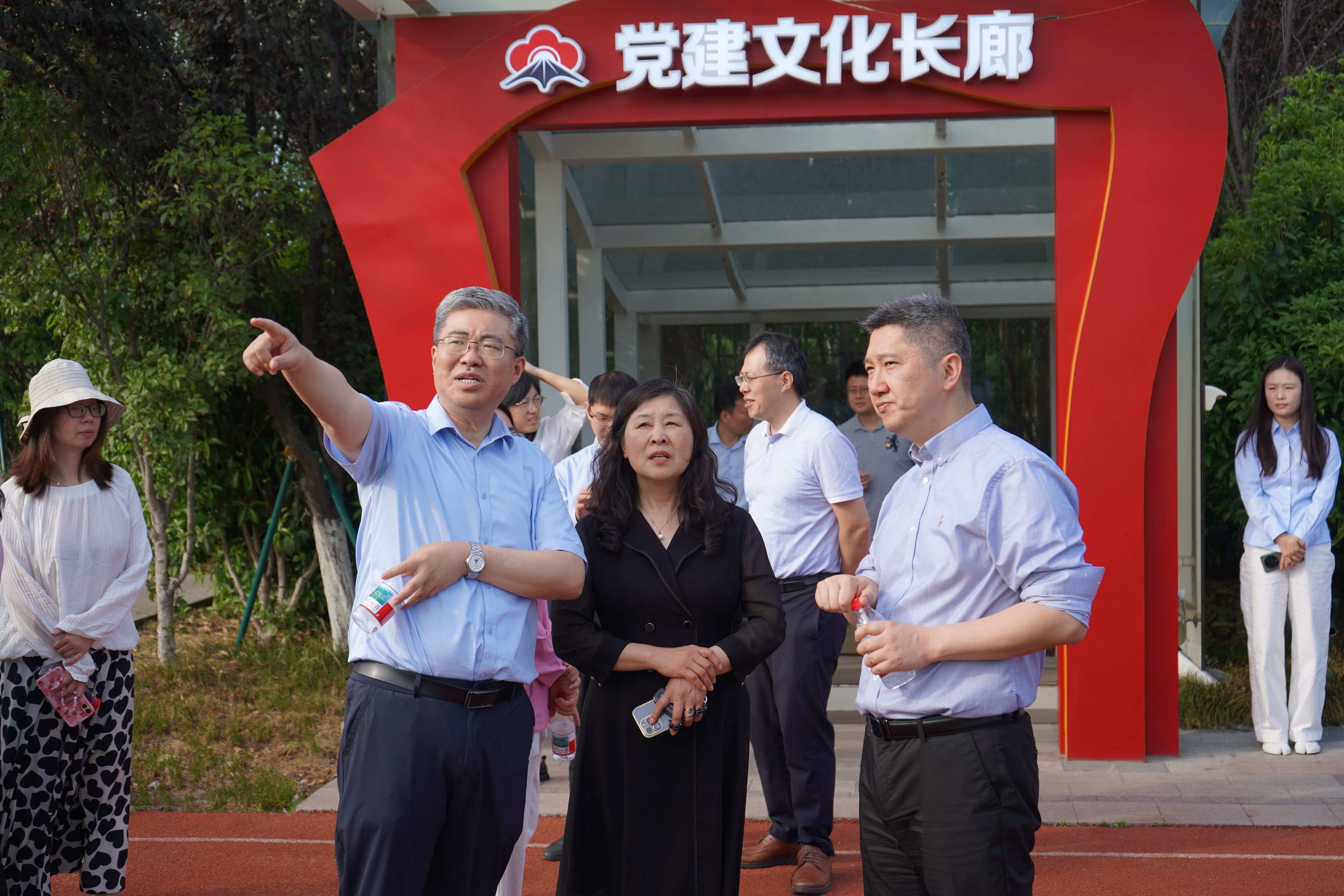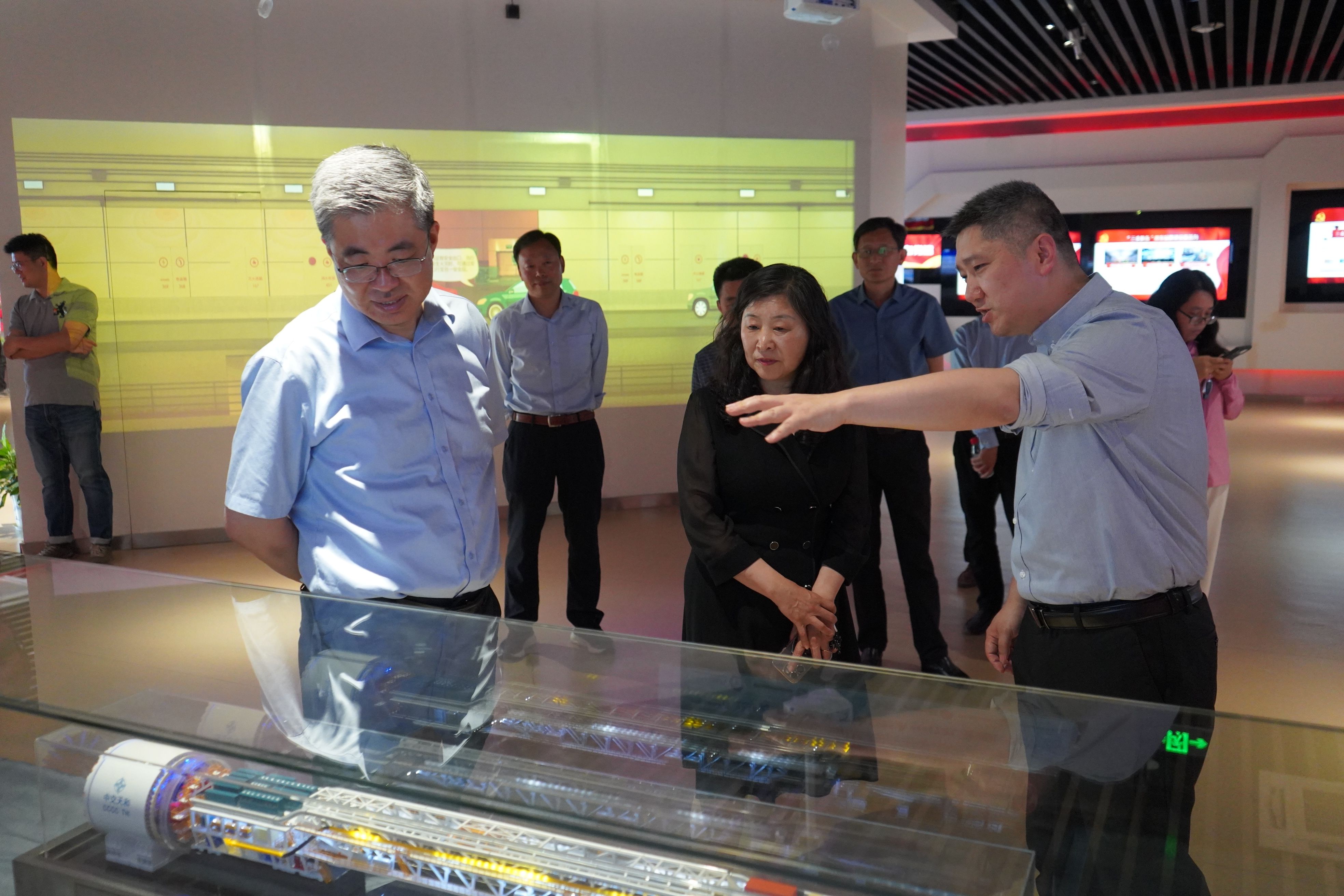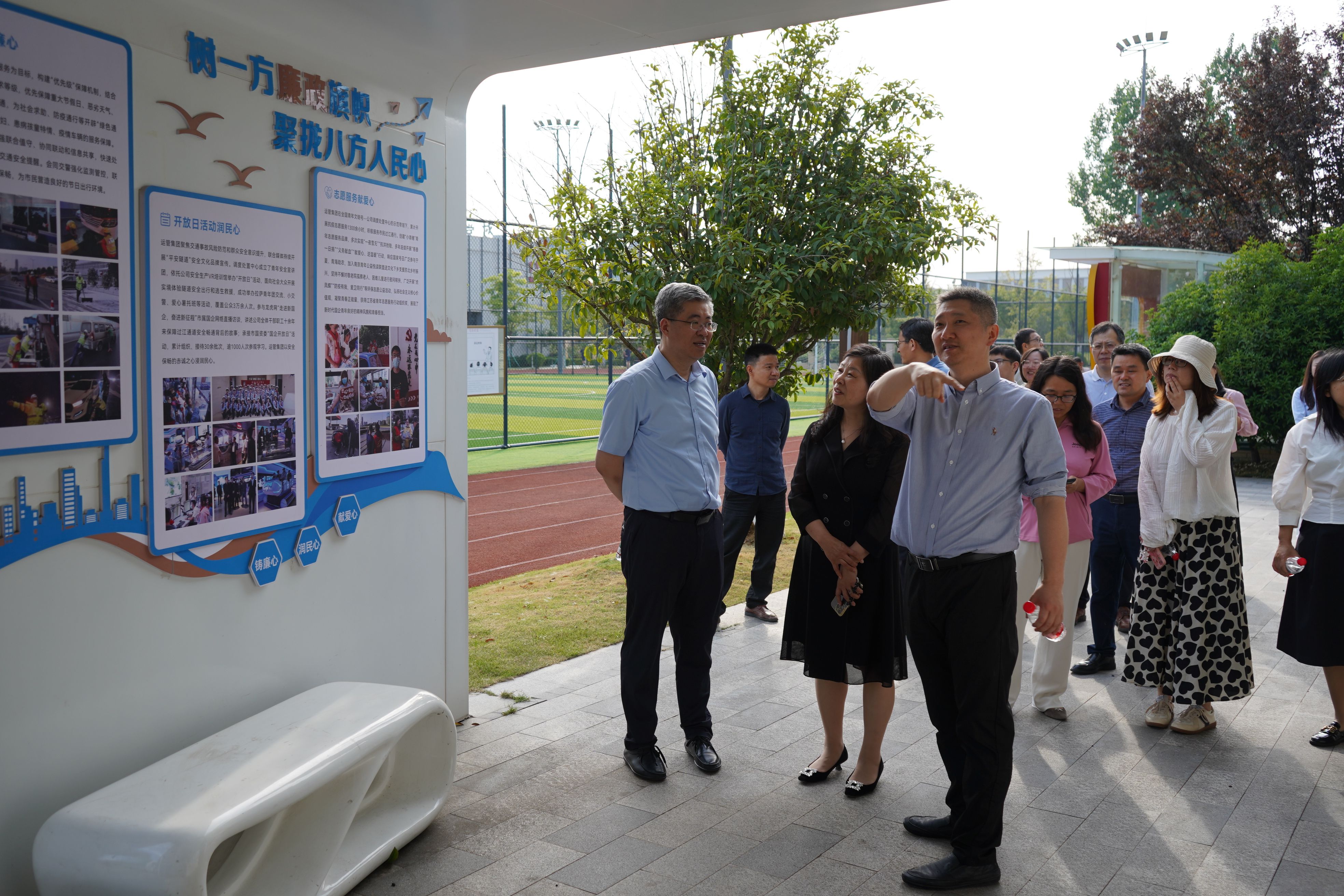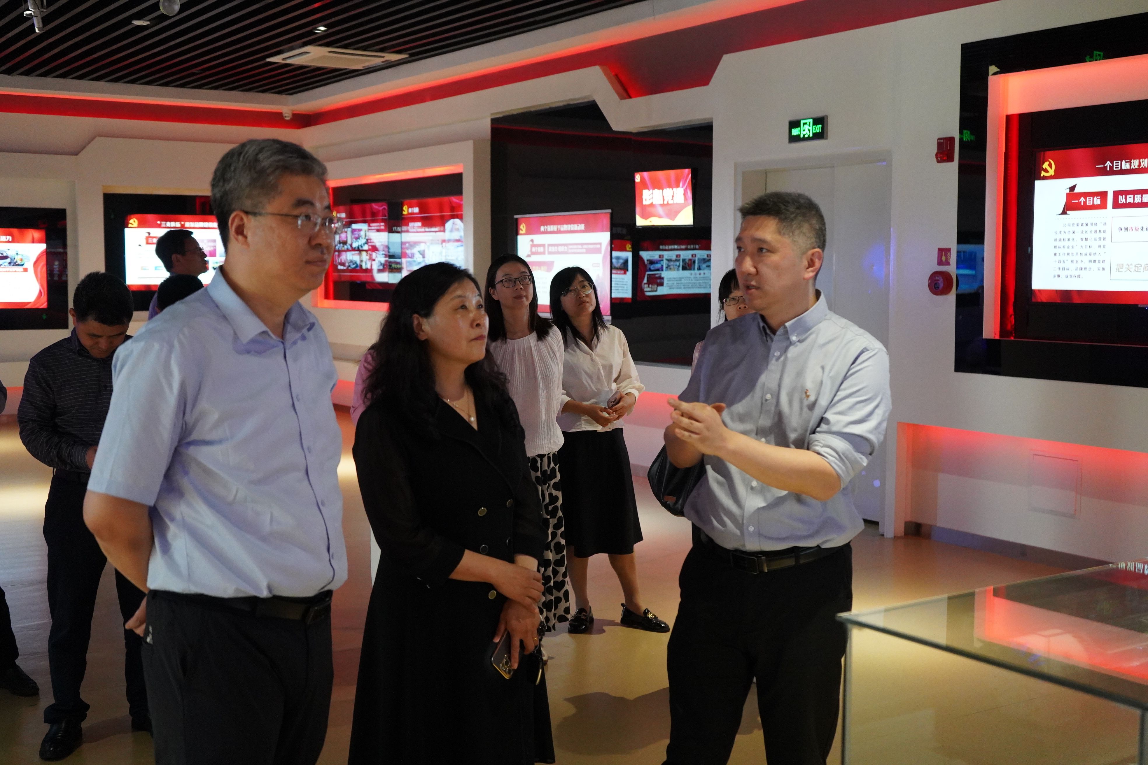 大家来到运管集团应天管理中心,在南京交通运管集团党委副书记、总经理游楠,党委副书记、副总经理张芸等人陪同下开启"三维立体"学习之旅。一行人首先踏入一楼VR培训馆,通过沉浸式党建主题展陈感受"智慧交通+红色引擎"的创新实践;随后移步四楼运营指挥调度中心,现场观摩城市交通"智慧大脑"实时调度场景,深入探讨产学研协同创新路径;最后驻足党建廉政阵地,通过图文视频、互动装置等多元形式,学习"清廉交通"建设经验。