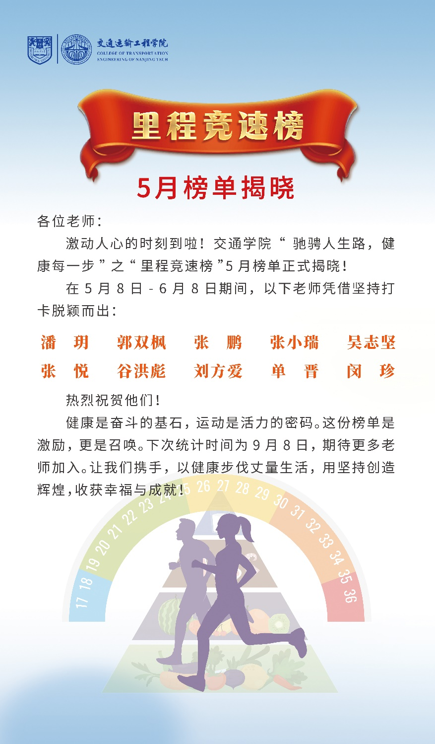 在5月8日至6月8日的首月评比中,潘玥、郭双枫等十位老师凭借出色的打卡表现,成功登上5月榜单,成为了大家心中的“运动之星”。