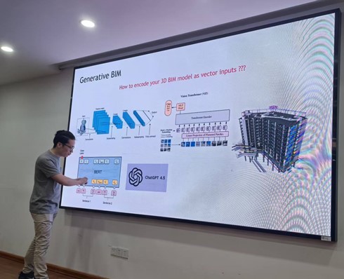 报告开场,汪军博士以巧妙提问激发师生对BIM技术的浓厚兴趣。随后,汪军博士着重介绍了其研发团队基于BIM技术打造的MetaBIM系统,该系统创新融合AI与区块链技术搭建起智能化协同平台,借助机器学习算法能够自动生成多元设计方案,并围绕能耗、成本、美学等多重目标进行优化,显著提升设计效率与创新水平。在探讨生成式AI于建筑全流程的应用时,汪军博士指出,其价值远超辅助工具范畴,已然成为驱动各环节变革的核心力量。在场师生围绕报告内容与汪军博士进行了热烈的讨论,学术氛围浓厚。报告会结束后,王志华教授团队与汪军博士深入交流,双方期待在智能交通、智能建造等科研领域开展进一步合作,为学院学科转型与国际化发展注入强劲动力。