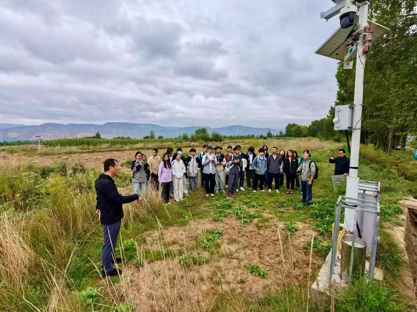 次日,师生一行前往青海省民和县中川乡金田村和草滩村,实地考察了积石山6.2级地震诱发的黄土液化泥流灾害,参观了公司吴志坚教授团队依托国家自然科学基金重点项目在该滑坡现场建设的滑坡监测预警示范场,严武建副研究员向同学们详细介绍了滑坡监测要素、方法、数据采集和传输手段,并从坡度、岩性、降水、地层产状和断裂等方面为大家解说了此次滑坡灾害的成因与治理情况。
