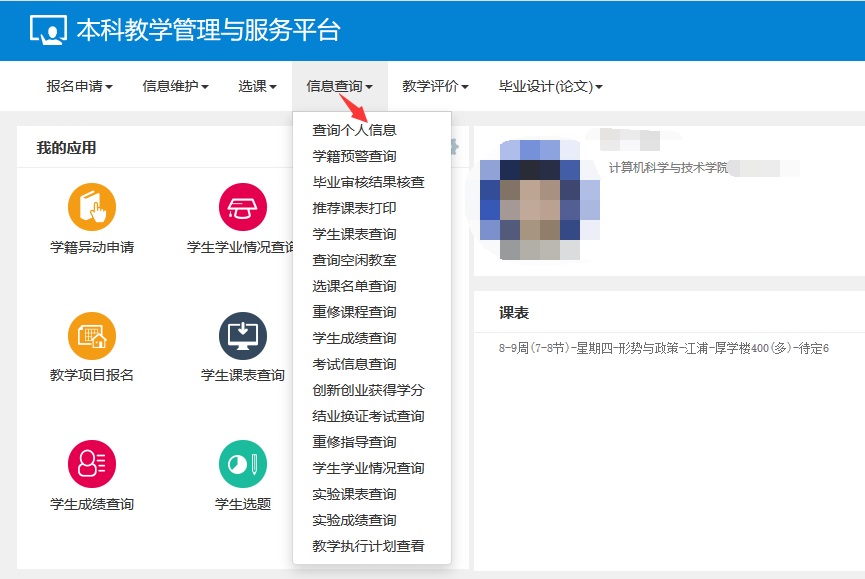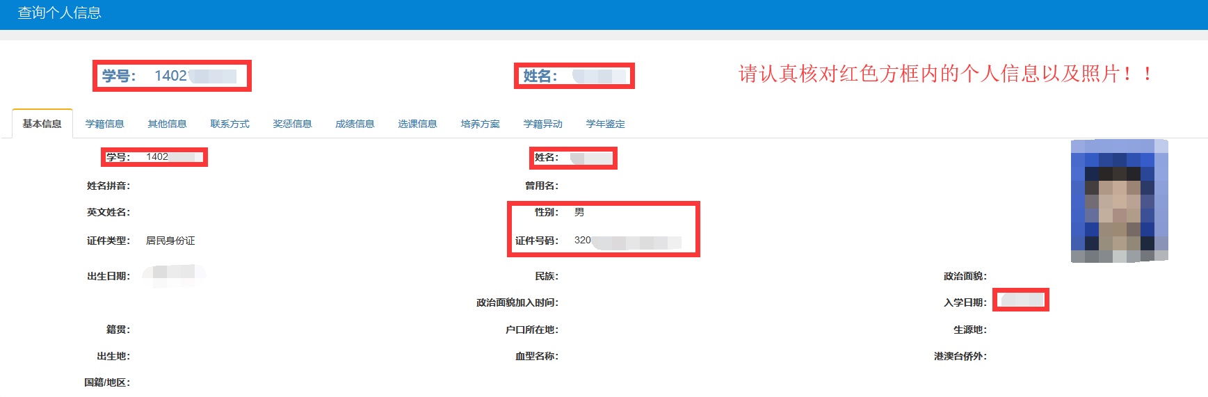 点击“信息查询”--“查询个人信息”,请仔细核对页面上的学号、专业班级、姓名、身份证号码等基本信息是否有误;仔细检查照片是否有误、有缺。