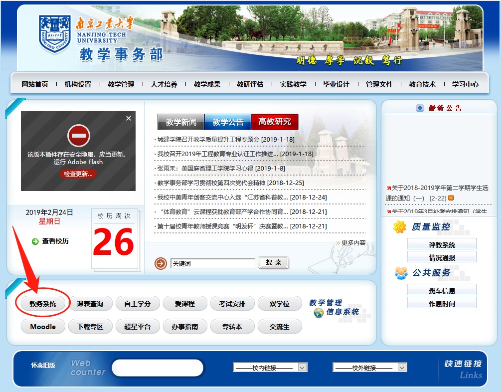 浏览器网址栏输入http://jwgl.njtech.edu.cn或从教学事务部主页点击“教务系统”进入登录界面,输入用户名及密码登录。