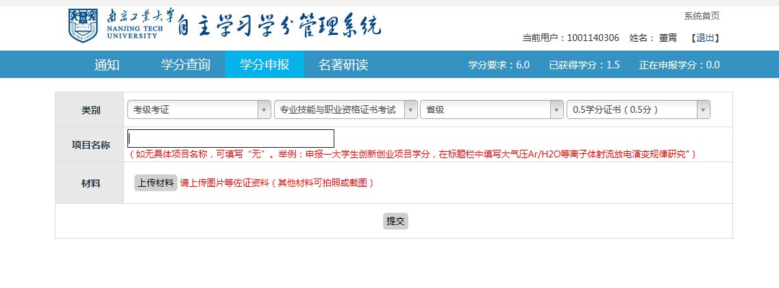 2. 申请:自主学习学分由员工本人提出申请,所在学院组织认定。除外语等级考试、江苏省计算机等级考试、网络视频课程、名著研读成绩由管理员统一导入外,其余均需员工本人凭正方教务系统的账号、密码登陆“自主学习学分管理系统”(http://202.119.249.14/)进行填报:点击“学分申报”-在下拉菜单中依次选择项目类别,项目名称可不填写-上传作证材料-点击提交。特别提醒:员工如申请1学分的“听学术报告或讲座”自主学习学分,需将2篇评论材料合并成一个文档上传。如分开上传系统只认0.5学分。