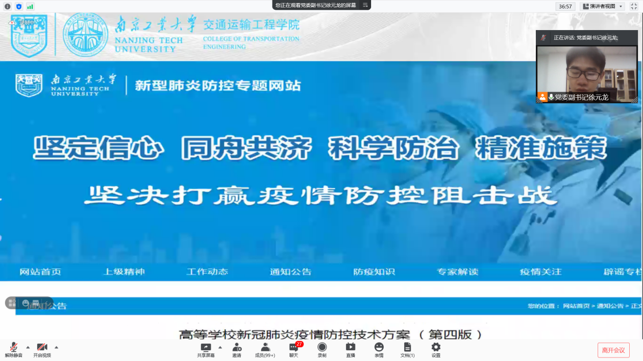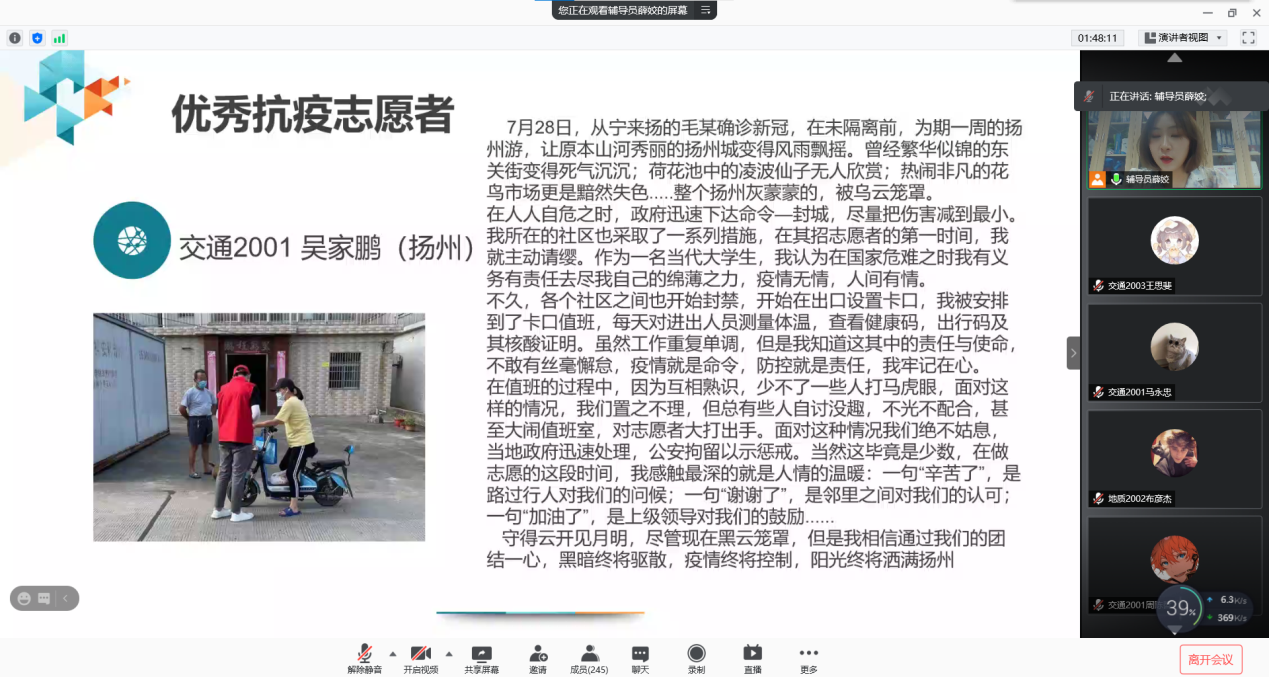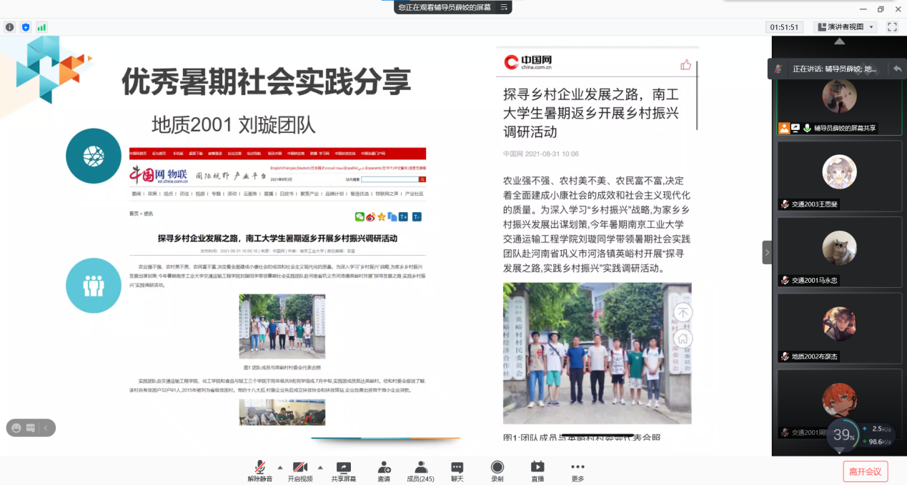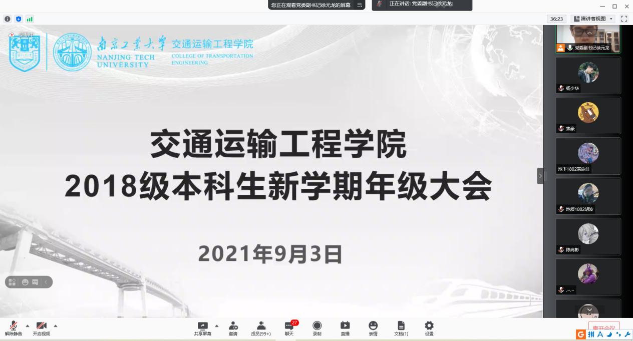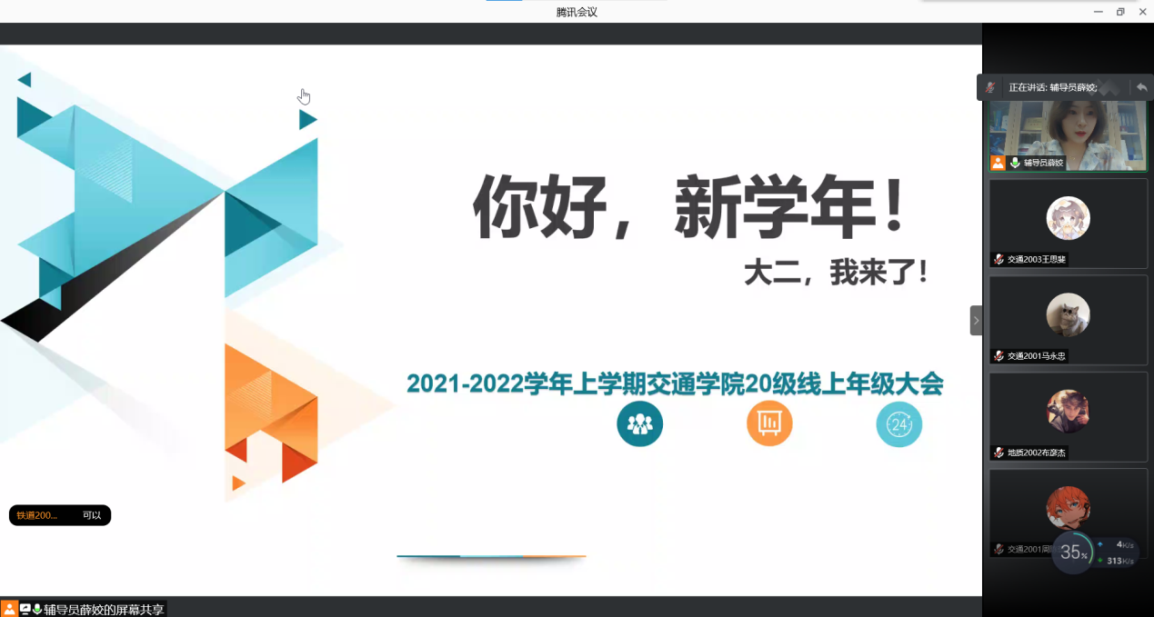 各年级辅导员老师围绕疫情防控知识、员工管理更新的制度文件、上学期学业成绩分析、线上学习与实习要求、第二课堂学时和学位制度等方面进行详细解读,对各年级员工新学年提出了学习指导建议。大四年级辅导员对同学们的求职与考研复习如何平衡以及生产实习中的安全注意事项给予了提醒。20级辅导员薛姣对分流至学院的土木类员工介绍了学院基本情况,并分班级召开线上视频见面会,表达对新学期的美好希望,同时对上学年学业进行深入分析并针对性提出指导意见。20级助理班主任结合一年来的带班经历和自身学习经验分享学习方法和技巧。暑假在抗疫抗洪一线工作的志愿者和优秀暑期社会实践团队代表做志愿服务分享,展示交院学子的青年担当。