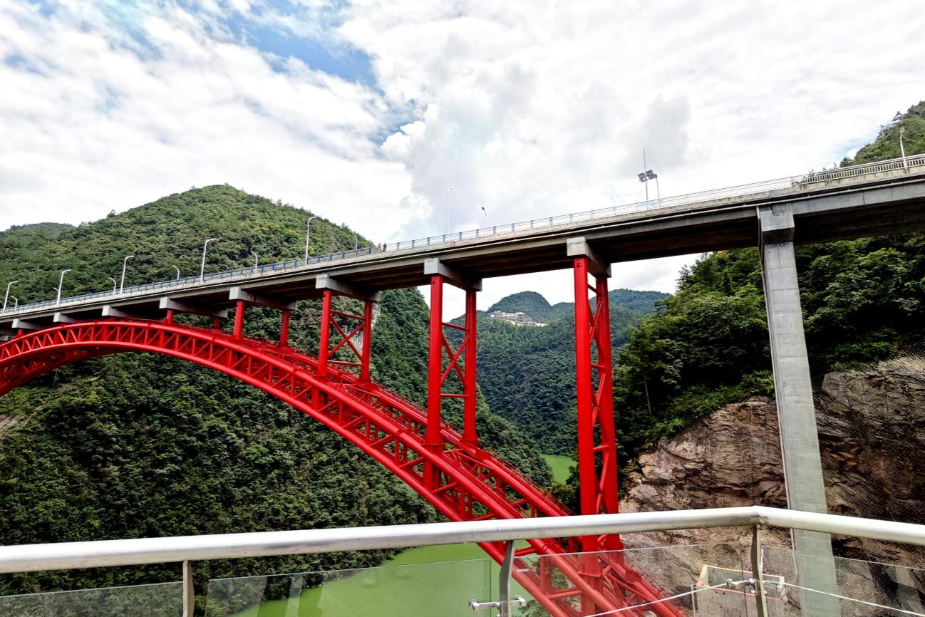 实践团恩施小分队来到唐崖河上,看到朝阳大桥如一道彩虹凌空而起,与湖光山色辉映成趣。朝阳大桥于20221125日正式建成通车。大桥总长276米,为上承式钢管混凝土拱桥,红色拱架,蔚为壮观。朝阳大桥及唐朝旅游公路建成通车,不仅解决了村民出行难问题,还对整合恩施咸丰县旅游资源,构建大交通、发展大旅游起到促进作用。